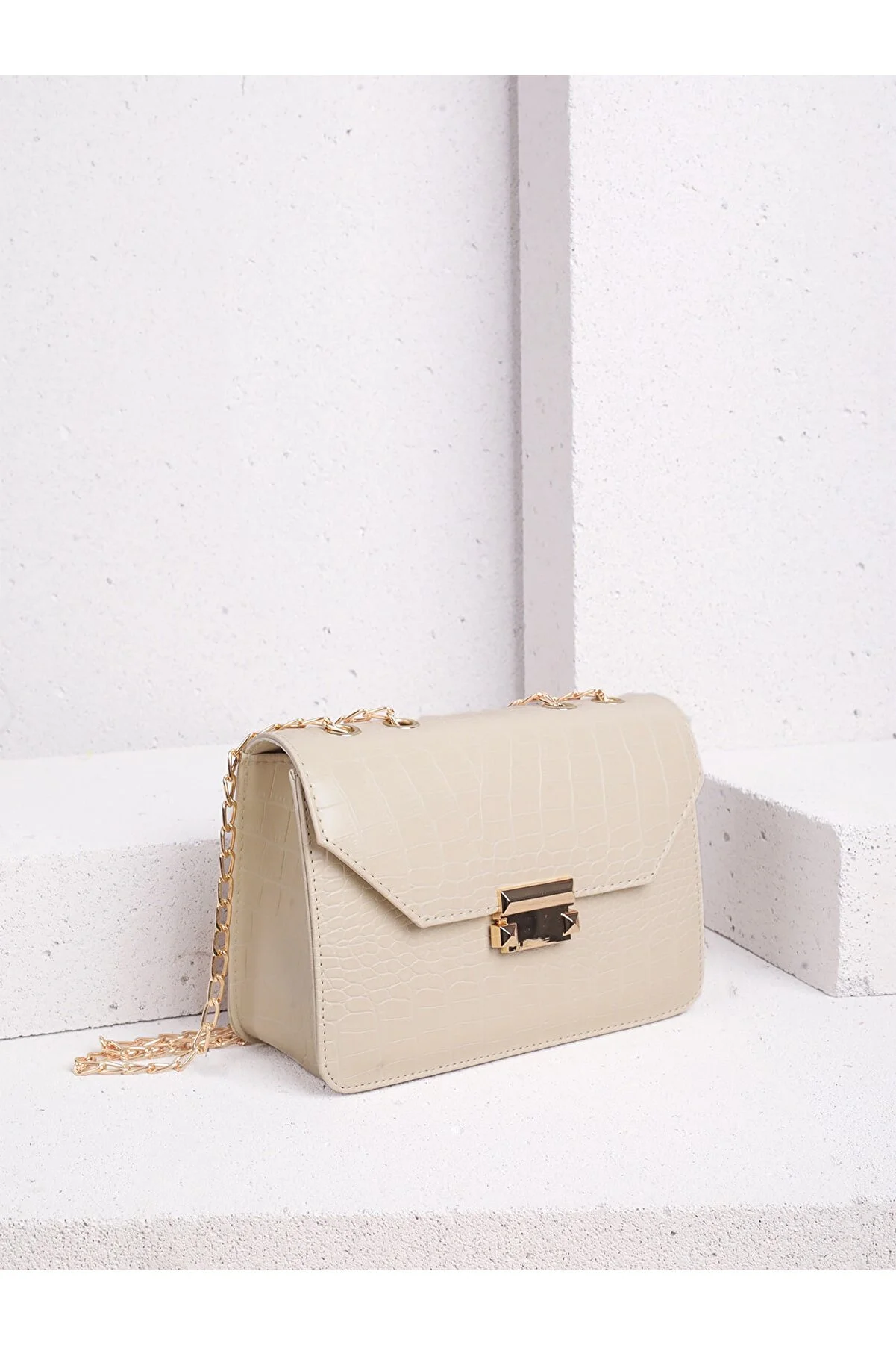 Kadın Krem Kroko Zincirli Çanta